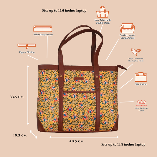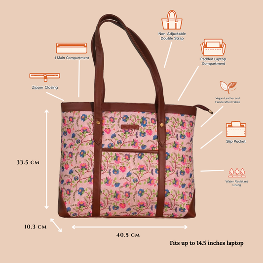 Handcrafted Floral Laptop Tote with Vegan Leather Handles fits upto 14.5 size laptop
