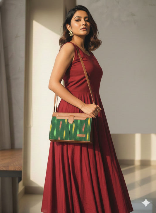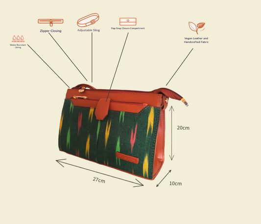 Style and Culture Handcrafted Emerald Ikat & Tan Vegan Leather Crossbody Sling Bag