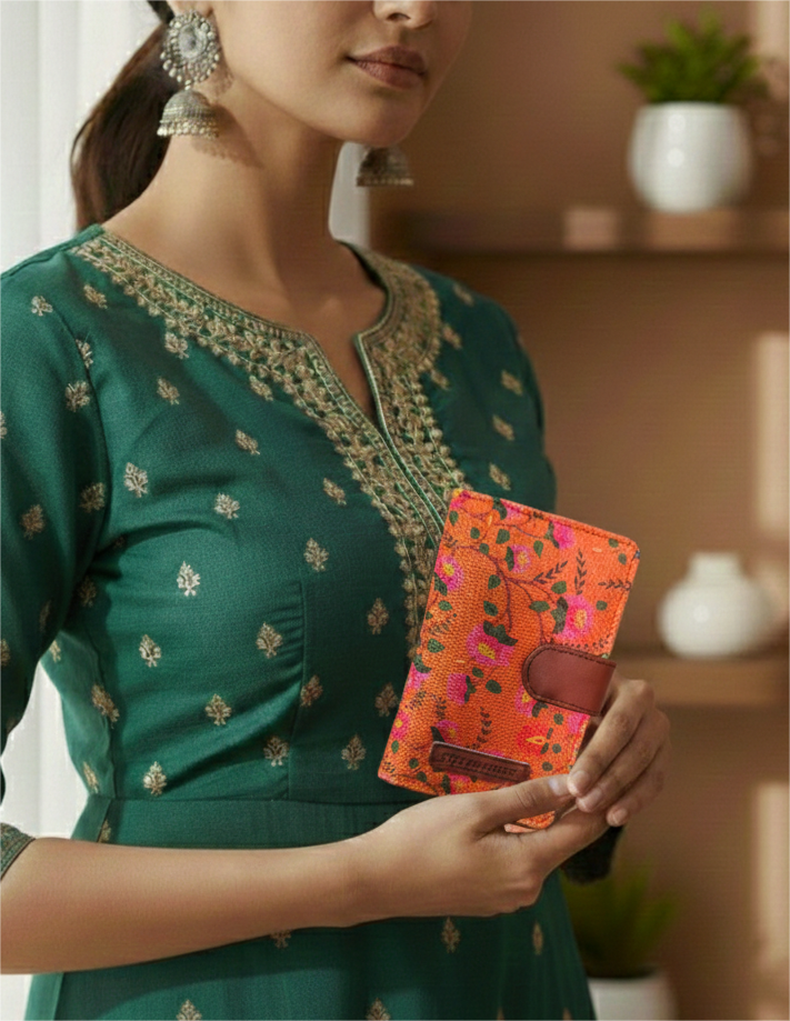 Add a touch of handcrafted elegance to your everyday essentials with this floral print mini card wallet from Style and Culture. Designed with vibrant heritage-inspired floral motifs and finished with premium vegan leather detailing, this compact wallet blends functionality with timeless style. Perfect for carrying your cards and small essentials in an organized, minimal form—ideal for daily use or gifting.