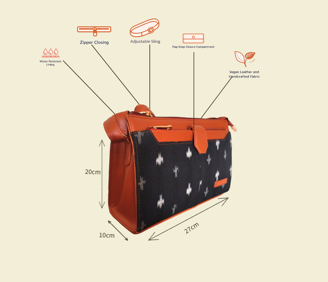 Elegant, versatile, and thoughtfully designed — this Black Ikat & Tan Vegan Leather Sling Bag blends classic style with everyday practicality. The monochrome Ikat pattern adds a refined handcrafted touch, while the structured silhouette and premium tan vegan leather detailing elevate the overall look. With dual zip compartments and easy-access front pockets, it keeps your essentials organised without compromising on style. Perfect for daily errands, outings, work, and travel.