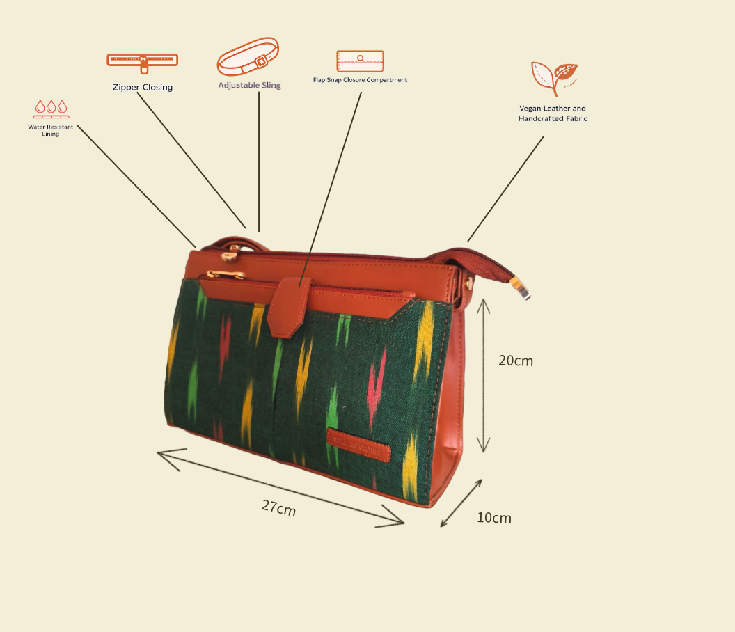 A perfect blend of tradition and modern elegance, the Emerald Ikat & Tan Vegan Leather Sling Bag adds effortless charm to your everyday look. Crafted with rich green Ikat fabric featuring vibrant hints of yellow and red, this bag stands out with its handcrafted appeal. The structured silhouette, premium tan vegan leather accents, and double-zip compartments offer both style and convenience. Lightweight yet roomy, it’s the ideal everyday sling for work, travel, and casual outings.