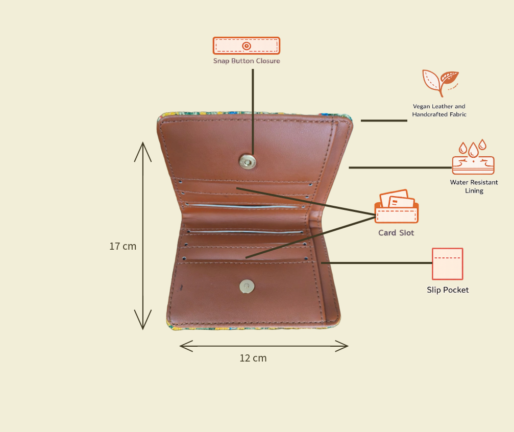A compact and stylish Vegan Floral Mini Wallet crafted with a turquoise heritage print exterior and premium tan vegan leather interior. Features multiple card slots, a secure snap closure, and a lightweight design—perfect for everyday essentials, cruelty-free and beautifully detailed.